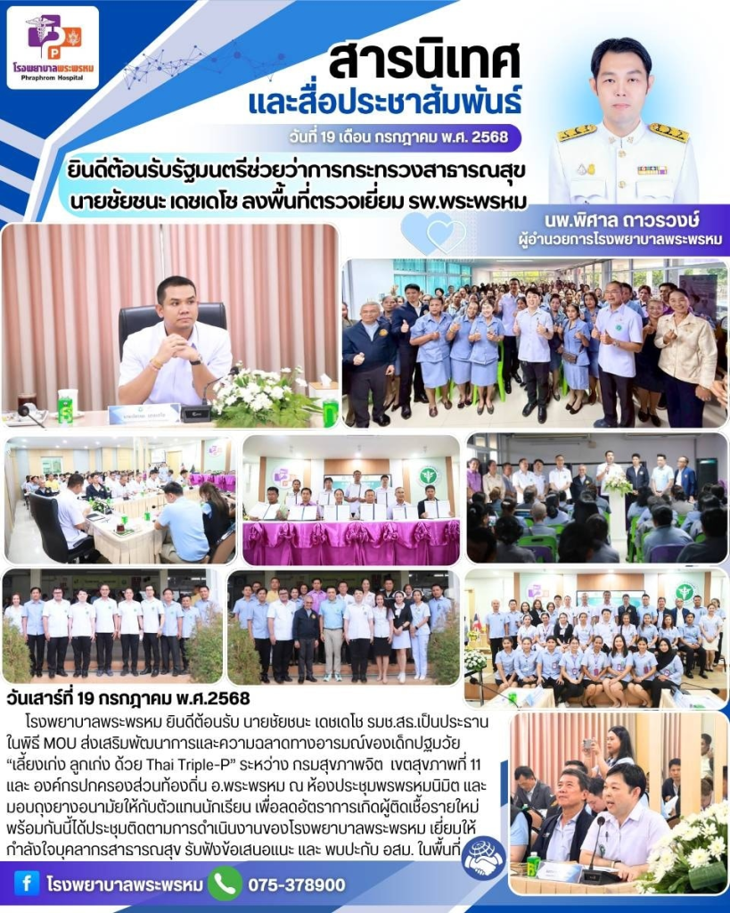 โรงพยาบาลพระพรหม ยินดีต้อนรับ นายชัยชนะ เดชเดโช รมช.สธ.เป็นประธานในพิธี MOU ส่งเสริมพัฒนาการและความฉลาดทางอารมณ์ของเด็กปฐมวัย “เลี้ยงเก่ง ลูกเก่ง ด้วย Thai Triple-P” ระหว่าง กรมสุขภาพจิต เขตสุขภาพที่ 11 และ องค์กรปกครองส่วนท้องถิ่น อ.พระพรหม ณ ห้องประชุมพรพรหมนิมิต และมอบถุงยางอนามัยให้กับตัวแทนนักเรียน เพื่อลดอัตราการเกิดผู้ติดเชื้อรายใหม่ พร้อมกันนี้ได้ประชุมติดตามการดำเนินงานของโรงพยาบาลพระพรหม เยี่ยมให้กำลังใจบุคลากรสาธารณสุข รับฟังข้อเสนอแนะ และ พบปะกับ อสม. ในพื้นที่
