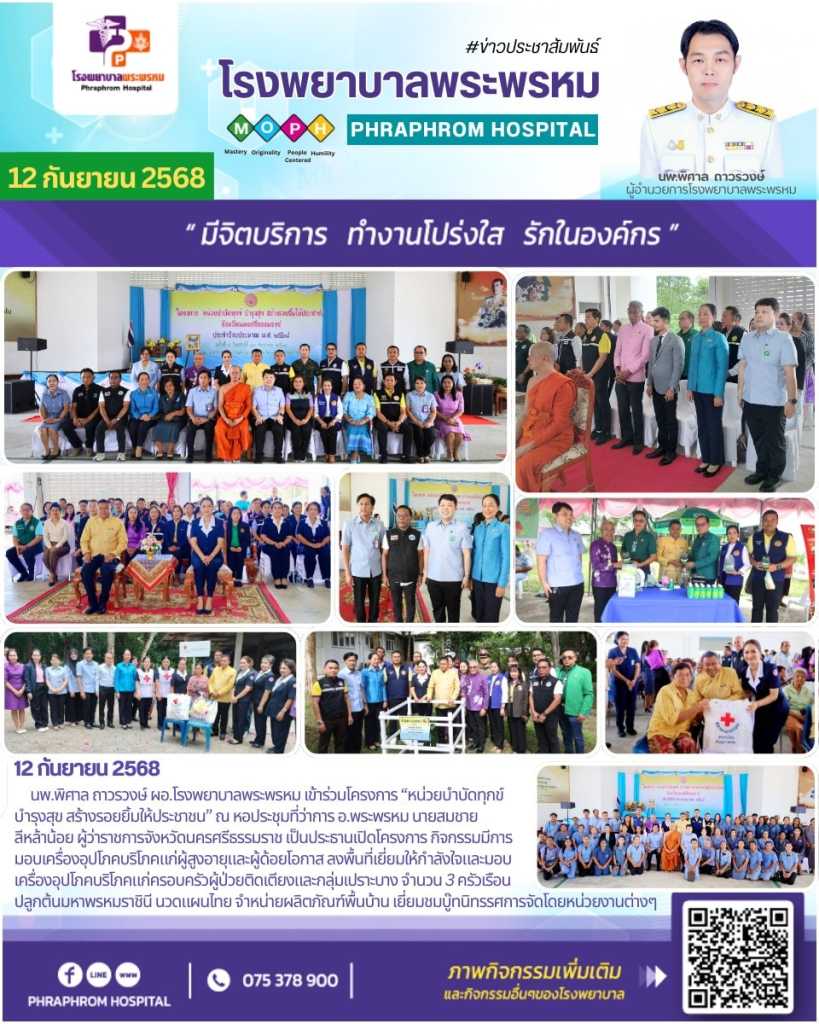 12 กันยายน 2568 นพ.พิศาล ถาวรวงษ์ ผอ.โรงพยาบาลพระพรหม เข้าร่วมโครงการ “หน่วยบำบัดทุกข์ บำรุงสุข สร้างรอยยิ้มให้ประชาชน” ณ หอประชุมที่ว่าการ อ.พระพรหม